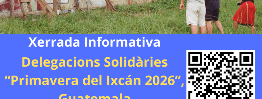 Las delegaciones solidarias son grupos de personas que, convocadas por Entrepueblos y USTEC·STEs (IAC), viajan a Guatemala para realizar acompañamiento y presencia internacional.A su regreso, las personas participantes expresan que es un placer y una fuente de aprendizajes, de encuentros y de amistades, como reflejo de su estancia en las comunidades (últimamente, sobre todo en Primavera del Ixcán).Desde julio de 1993, cada año hemos abierto el proceso de preparación de estas delegaciones, únicamente interrumpidas durante el tiempo de la pandemia y retomadas el curso pasado.En esta jornada informativa presentaremos las Delegaciones Solidarias 2026, compartiremos experiencias y explicaremos cómo participar en esta propuesta de solidaridad internacionalista y feminista.