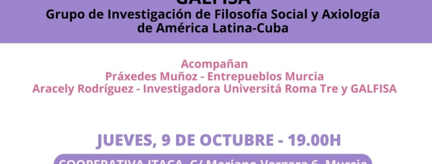 Presentan y acompañan: Práxedes Muñoz (Entrepueblos Murcia) y Aracely Rodríguez, investigadora de la Università Roma Tre e integrante de GALFISA.