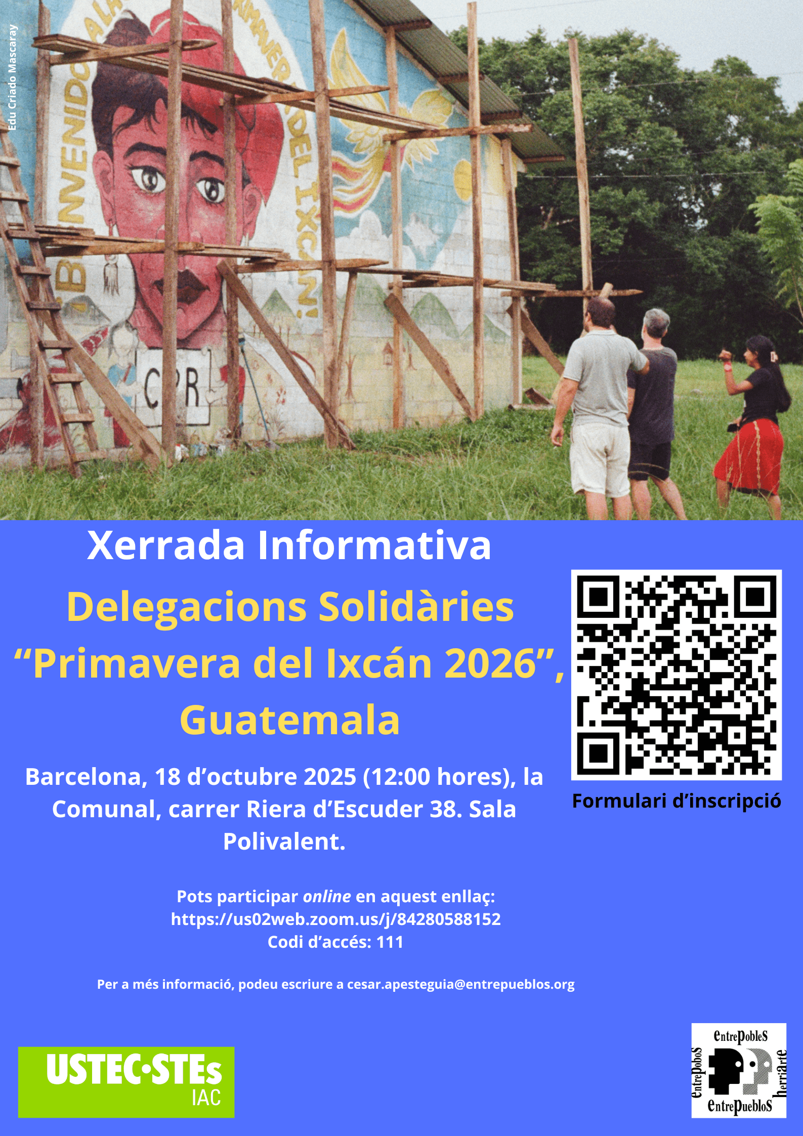 Las delegaciones solidarias son grupos de personas que, convocadas por Entrepueblos y USTEC·STEs (IAC), viajan a Guatemala para realizar acompañamiento y presencia internacional.A su regreso, las personas participantes expresan que es un placer y una fuente de aprendizajes, de encuentros y de amistades, como reflejo de su estancia en las comunidades (últimamente, sobre todo en Primavera del Ixcán).Desde julio de 1993, cada año hemos abierto el proceso de preparación de estas delegaciones, únicamente interrumpidas durante el tiempo de la pandemia y retomadas el curso pasado.En esta jornada informativa presentaremos las Delegaciones Solidarias 2026, compartiremos experiencias y explicaremos cómo participar en esta propuesta de solidaridad internacionalista y feminista.