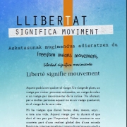 ‘Llibertat significa moviment’ podria ser qualsevol viatge. Un viatge de plaer, un viatge per visitar persones estimades, un viatge de relax o un viatge per desconnectar de la rutina. No obstant, per a moltes persones aquest no és un viatge qualsevol, és el viatge de la seva vida. Hi ha viatges que duren hores, dies, mesos, anys… o tota una vida. Aquest viatge durarà per al visitant el que duri el seu pas per l’exposició.