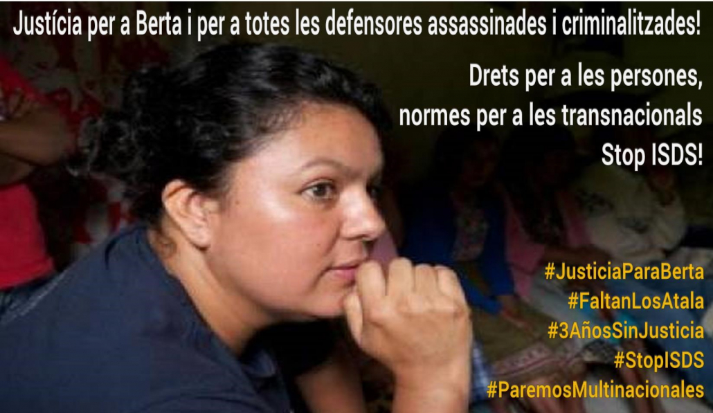 A 3 anys de la sembra de Berta Cáceres. “Drets per a les persones, normes per a les transnacionals – Stop ISDS”