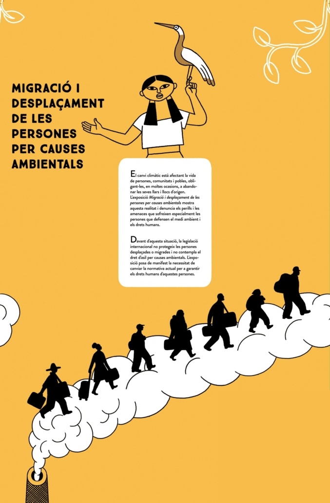 El canvi climàtic està afectant la vida de persones, comunitats i pobles, obligant-les, en moltes ocasions, a abandonar les seves llars i llocs d’origen. Mitjançant acolorides il·lustracions, l’exposició Migració i desplaçament de les persones per causes ambientals mostra aquesta realitat i denuncia els perills i les amenaces que pateixen especialment les persones que defensen el medi ambient i els drets humans.
