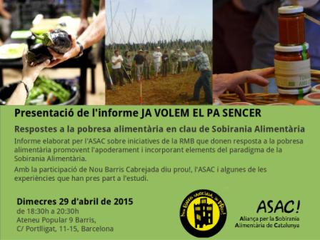 L’informe “Ja volem el pa sencer. Respostes a la pobresa alimentària en clau de Sobirania Alimentària” analitza què aporten en l’actual context d’emergència social les iniciatives que tracten de donar resposta a la pobresa alimentària promovent l’apoderament de les persones en situació de vulnerabilitat social i incorporant elements del paradigma de la Sobirania Alimentària.